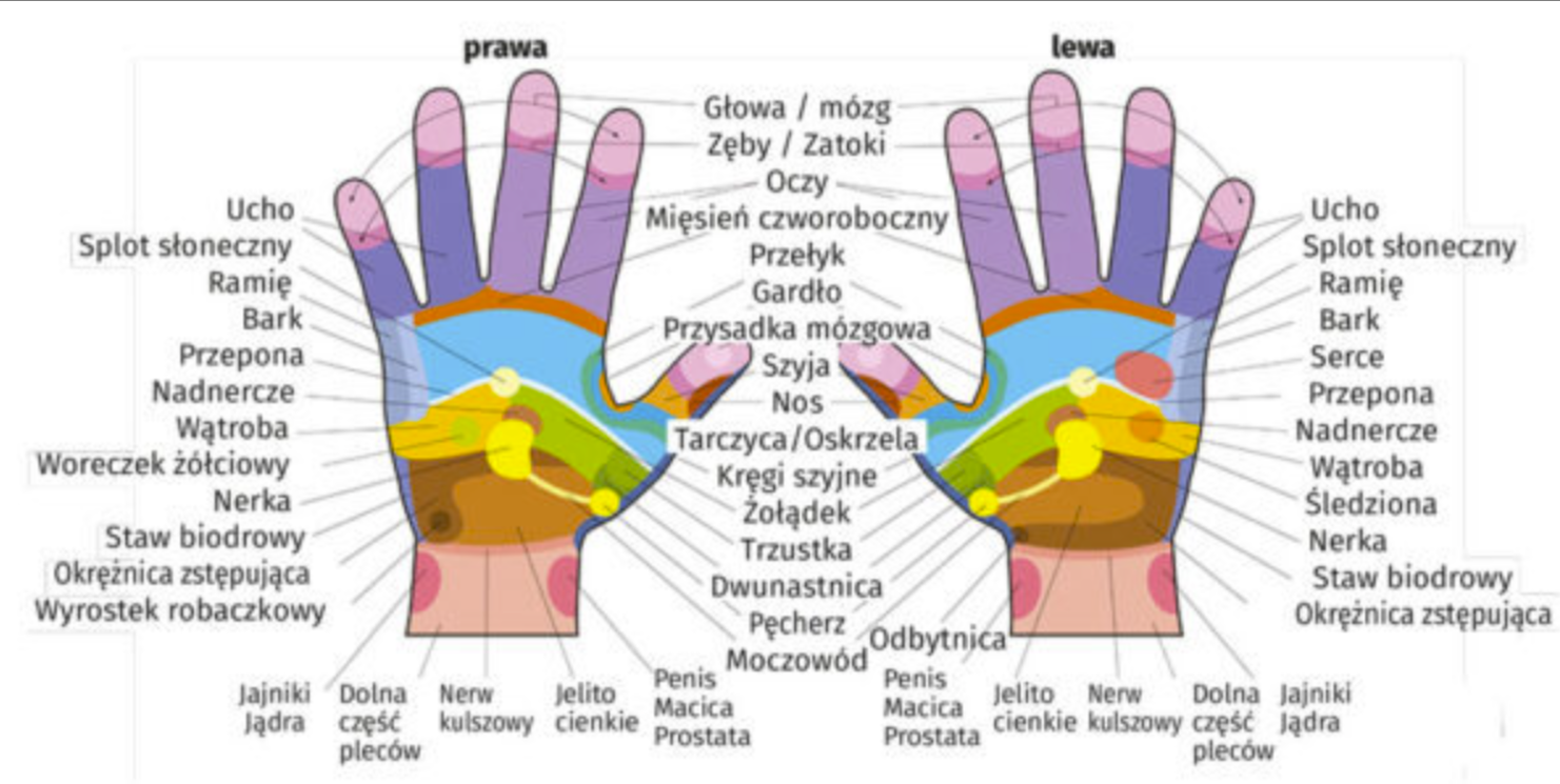 - Refleksologia, praca na strefach dłoni według mapy.